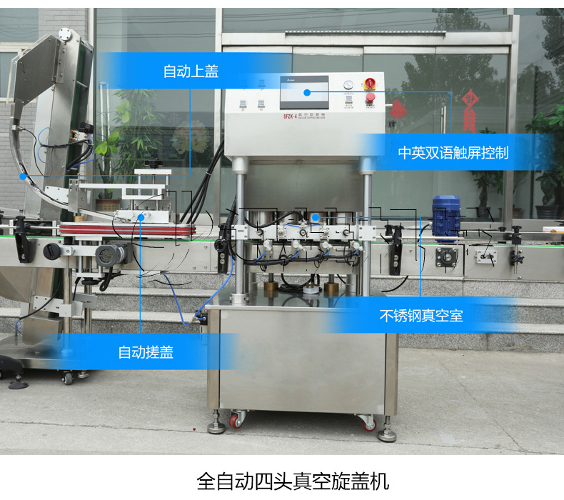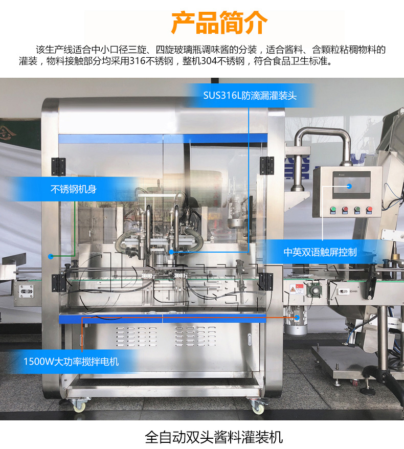 該生產(chǎn)線適合中小口徑三旋、四旋玻璃瓶調味醬的分裝,適合醬料、含顆粒黏稠物料的灌裝,物料接觸部分均采用316不銹鋼