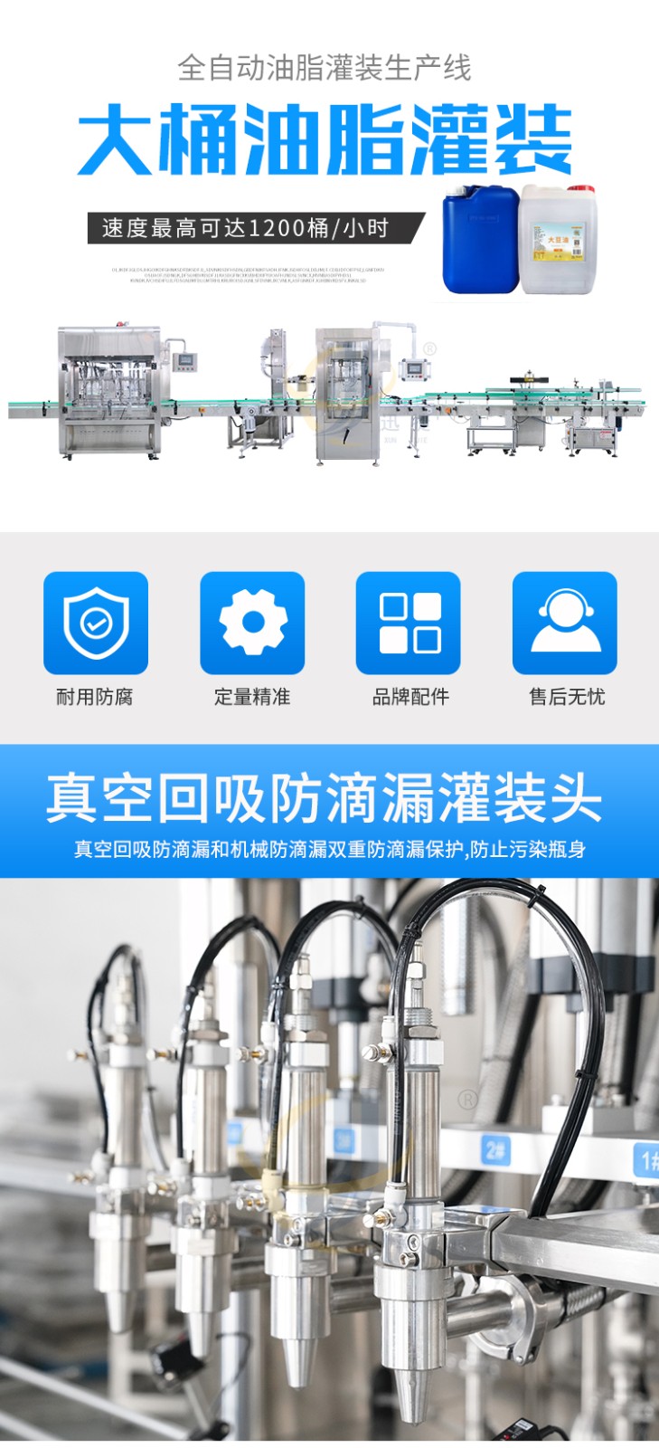 全自動油脂灌裝生產(chǎn)線適用于灌裝各種油類及粘稠液體,如花生油、調(diào)和油、菜籽油等食用油的灌裝??筛鶕?jù)灌裝需求定制機型。