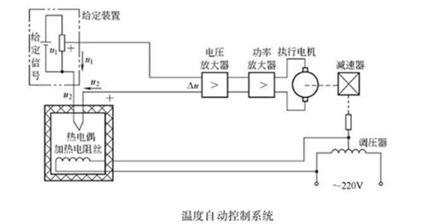 如果將控溫過程中的人工操作 (檢測和調節(jié)) 換由自動控制裝置完成,則成為包裝機自動控溫系統(tǒng)。如下圖所示,檢測元件熱電偶檢測恒溫箱內的溫度,并將溫度轉換為對應的電壓信號2 ,同時反饋給比較器。比較器比較表示給定溫度的給定電壓信號1與檢測電壓信號2的大小,得到溫差信號,其大小和正負代表溫差的大小和方向。溫差信號△經電壓放大和功率放大后,控制執(zhí)行電機的轉速和方向,執(zhí)行電機通過傳動裝置拖動調壓器觸頭調節(jié)供熱電壓。當溫度偏高時,動觸頭向著減小電壓( 電流)方向轉動; 反之,當溫度偏低時,動觸頭則向著增大電壓( 電流)方向運動,直至恒溫箱內溫度達到給定溫度,溫差信號△=0 時觸頭停止運動。